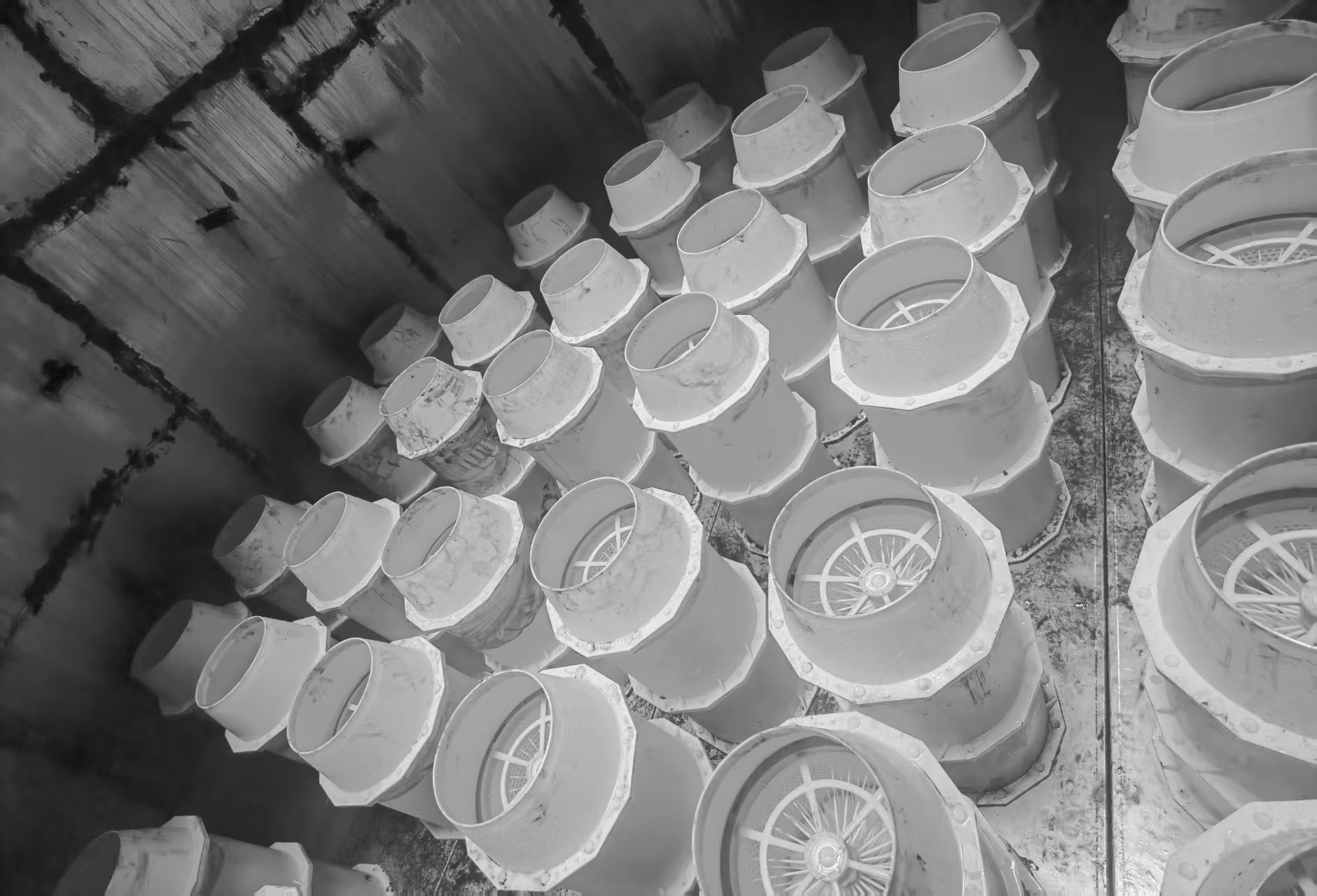 该设备在塔内烟气的驱动下叶轮高速旋转,使中心轴上密集分布的270条鞭稍对烟气中的水和尘进行九次拦截,同时对烟气进行反复猛烈的鞭笞,将烟气中的水和尘进行强制分离,在高速离心力的作用下,将分离出的水和尘聚集到筒壁收集箱,在重力的作用下自身沉降,完成整个烟气净化。