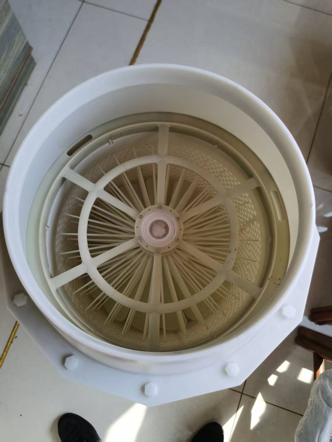 该设备在塔内烟气的驱动下叶轮高速旋转,使中心轴上密集分布的270条鞭稍对烟气中的水和尘进行九次拦截,同时对烟气进行反复猛烈的鞭笞,将烟气中的水和尘进行强制分离,在高速离心力的作用下,将分离出的水和尘聚集到筒壁收集箱,在重力的作用下自身沉降,完成整个烟气净化。